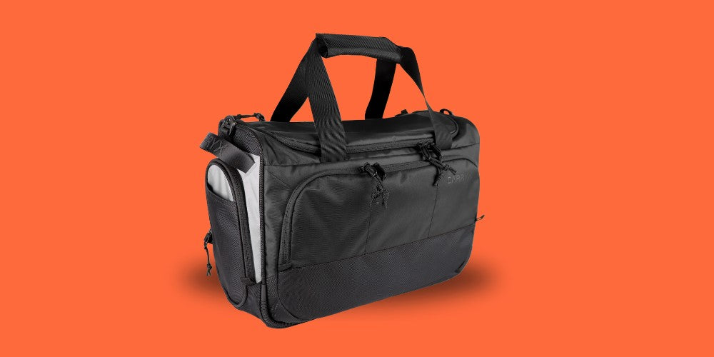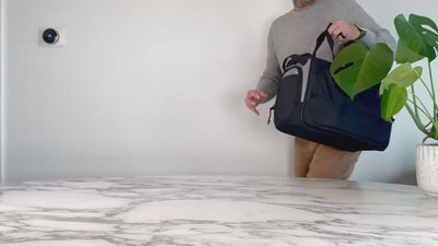 Comfortable hand carry, secure roller-bag pass-thru, adjustable crossbody, and a cushioned shoulder strap that magnetically stows when not in use.